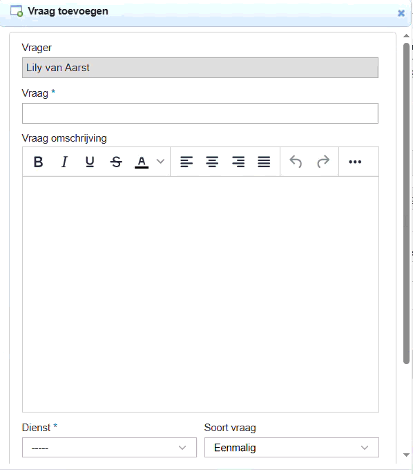 Een vraag kan worden toegevoegd via het dossier van een vrager op de eerste tab Vragen middels de knop Vraag toevoegen. Bij een vraag dienen de volgende velden ingevuld te worden: