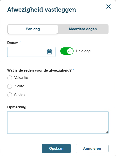 Bij het toevoegen van afwezigheid geef je aan of een persoon één dag of meerdere dagen afwezig zal zijn.