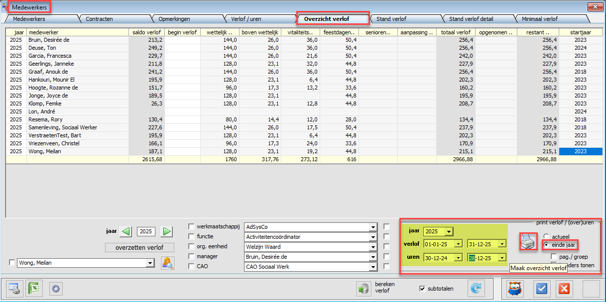 - Klik rechts onderaan op de knop met het printertje ('Maak overzicht verlof')