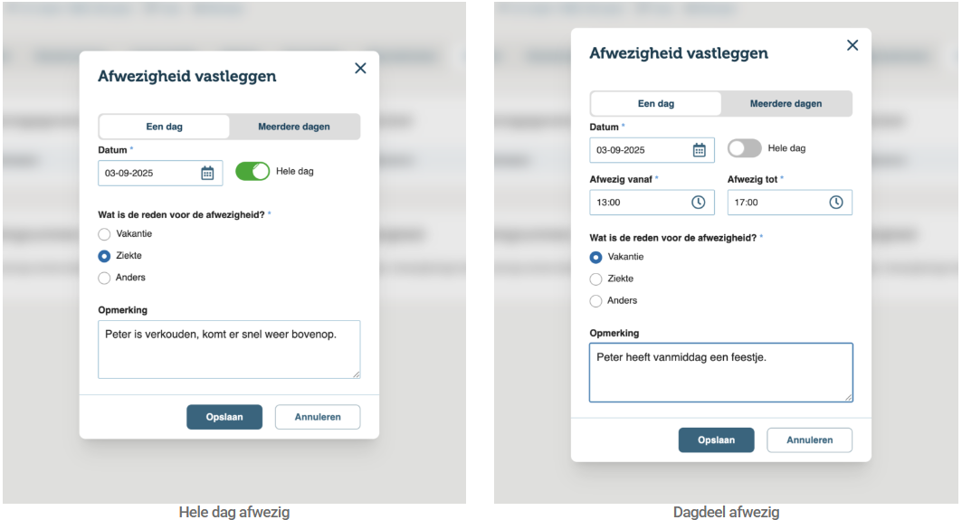 - Flexibel registreren: afwezigheid kan nu ook per dagdeel (uren) worden opgegeven.