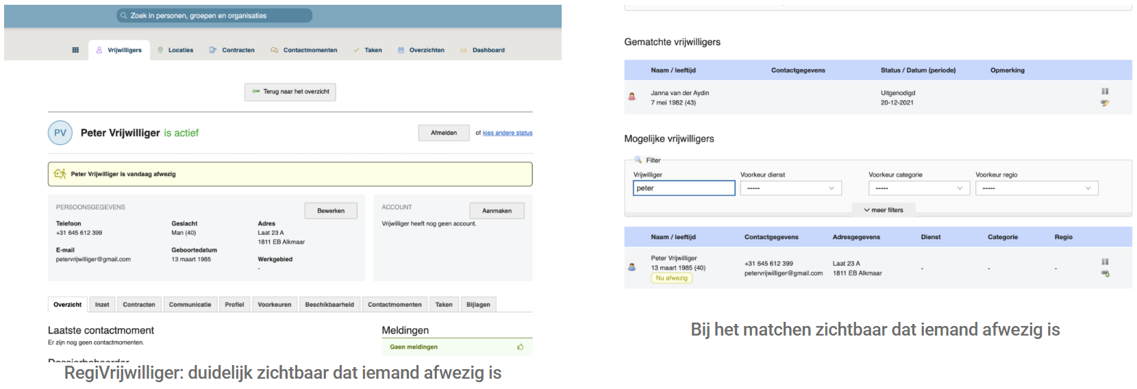 Direct zichtbaar: open je de persoonskaart van bijvoorbeeld een vrijwilliger die afwezig is, dan wordt dat nu direct weergegeven. Ook bij het zoeken naar vrijwilligers (matchen) wordt afwezigheid direct in de schermen getoond.