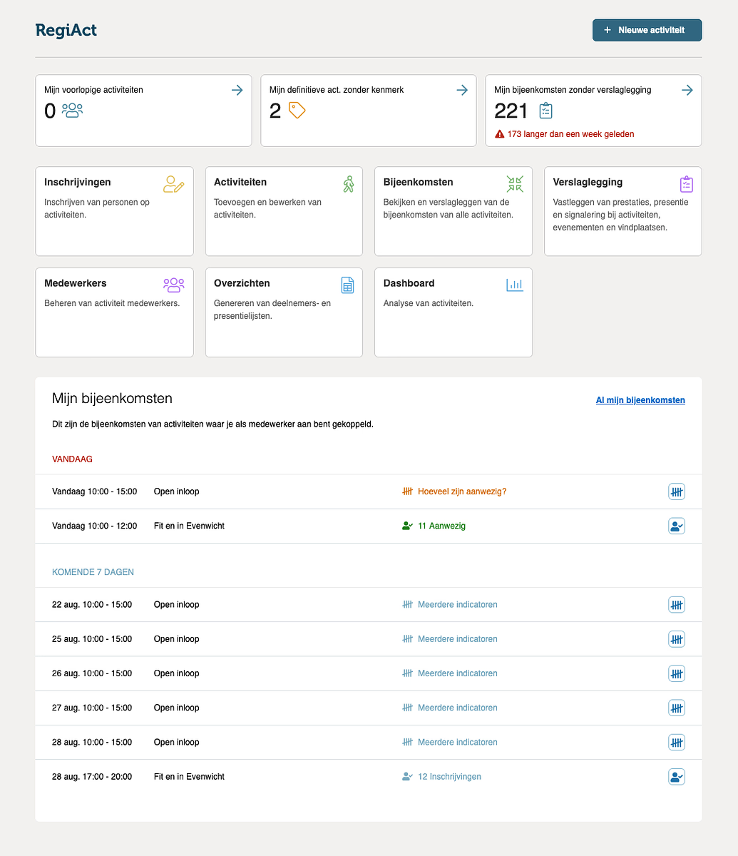 Daarnaast vind je op het scherm een nieuw blok met jouw bijeenkomsten van vandaag en de komende 7 dagen. Handig: je kunt direct de verslaglegging doen van de activiteiten van vandaag en in één oogopslag zien wat er nog op je agenda staat.