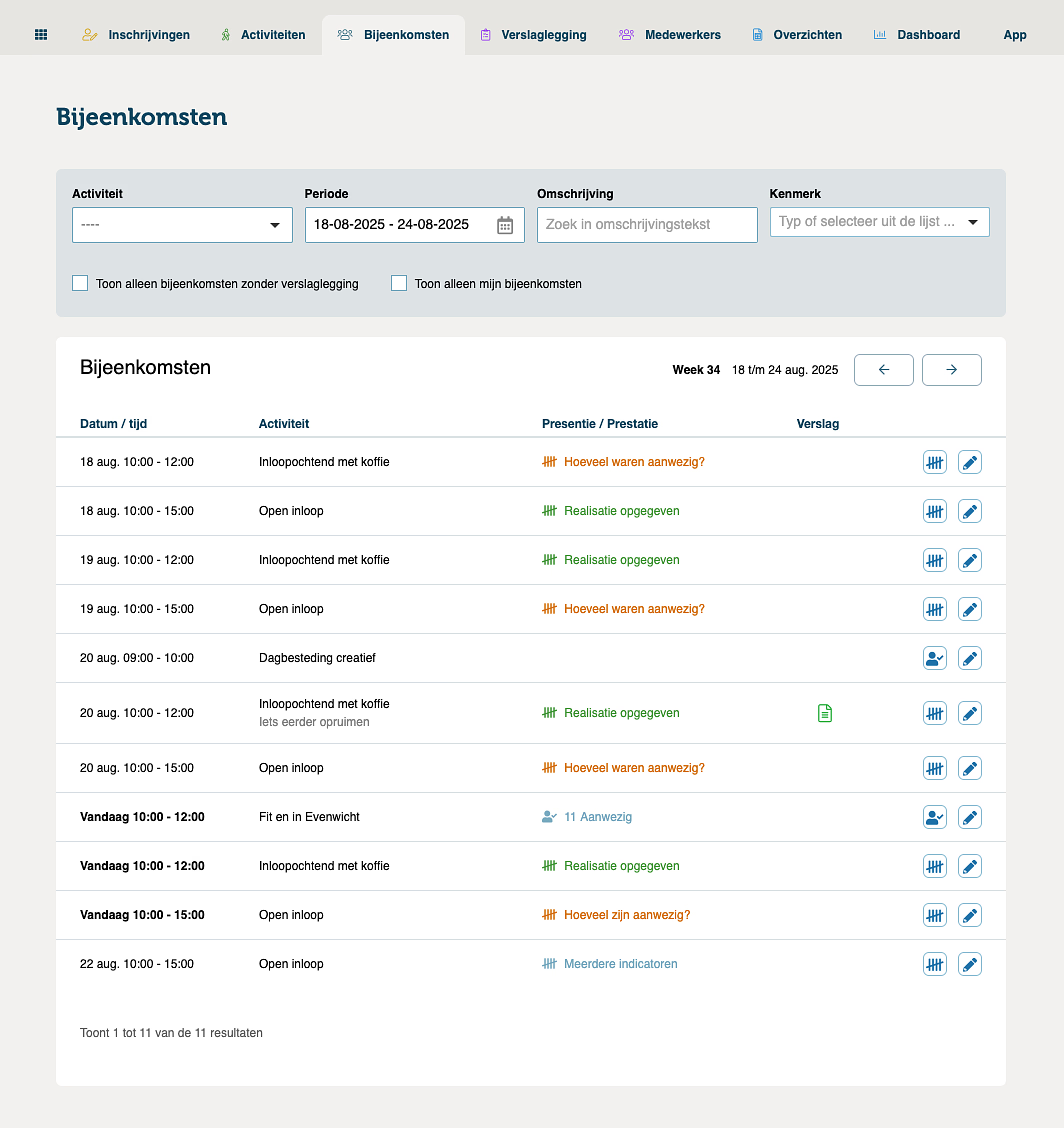 - Slim filteren: toon alleen bijeenkomsten van jouw activiteiten, alleen die zonder verslaglegging, of filter op kenmerken van de activiteit. Zo krijg je bijvoorbeeld in één oogopslag de status te zien van alle activiteiten die onder jongerenwerk vallen – deze week of deze maand.
