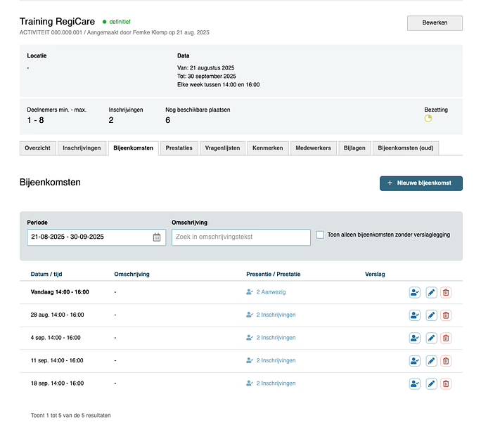 - Rolafhankelijk inzicht: applicatiebeheerders, modulebeheerders en gebruikers met de RegiAct-kijkersrol krijgen de informatie te zien over alle activiteiten. (Voorheen hadden ook coördinatoren dit brede overzicht, nu is het toegespitst op jouw eigen activiteiten.)