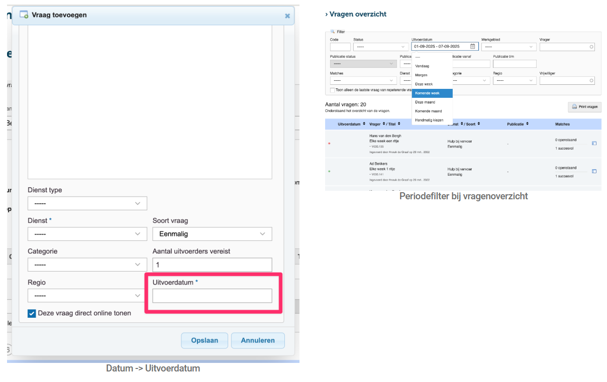 - Label aangepast: Het veld heette voorheen “datum (vanaf)”, dit is nu vervangen door het duidelijkere label “uitvoerdatum”. De uitvoerdatum is de datum waarop de vraag vervult moet worden.