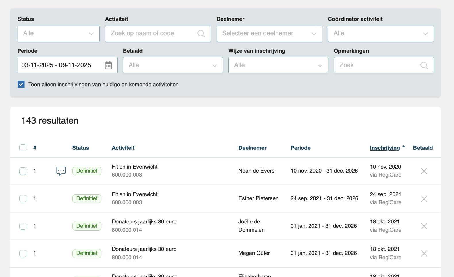 - Filters om eenvoudig een selectie te maken van voor jou relevante inschrijvingen: bijv. zoeken ook op status, deelnemer en opmerkingen