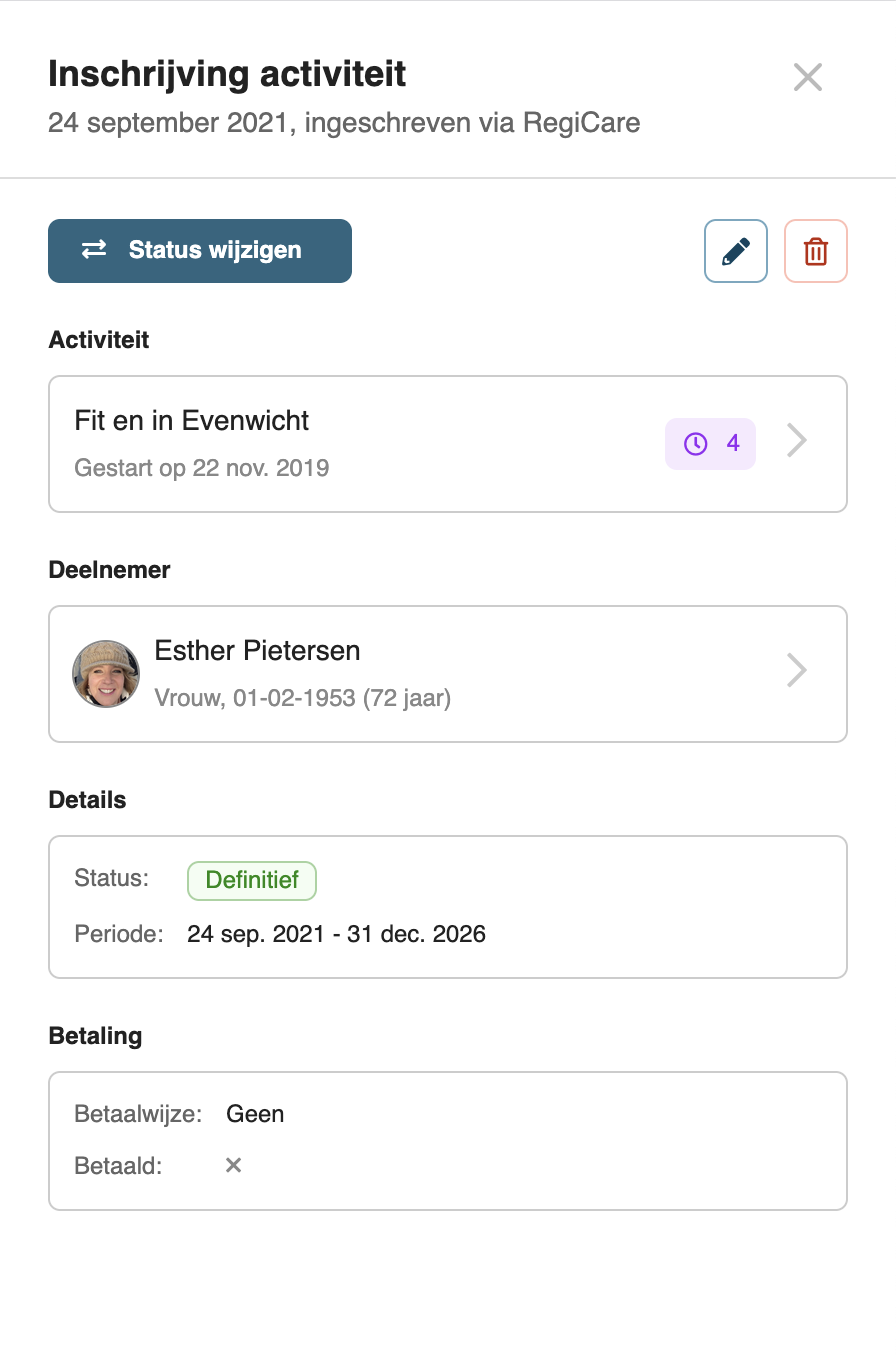 Door middel van een zijpaneel kun je snel de gegevens van de inschrijving, persoon en activiteit raadplegen. Klik op een inschrijving om meer informatie over die specifieke inschrijving te zien. Je kunt direct de status aanpassen (naar bijv. definitief).