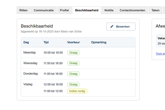 Het bijhouden van beschikbaarheid is essentieel om te weten wanneer vrijwilligers ingezet kunnen worden. Tot deze release gebeurde dat op verschillende plekken in RegiMatch / RegiVervoer nét even anders.