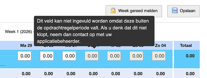 In de vorige versie van RegiTijd kon je in de urenstaat op elk datumveld van de week tijd registreren, ook als die datum buiten de opdrachtregelperiode viel (bijvoorbeeld vóór de start- of na de einddatum).