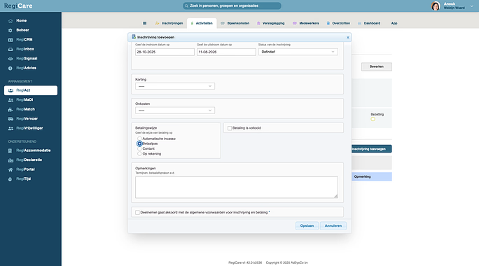 - Het was in RegiCare mogelijk om een gedeeltelijke aanbetaling te registreren bij het inschrijven van een deelnemer op een activiteit. Deze mogelijkheid zorgde vooral voor onduidelijkheid. De gedeeltelijke aanbetaling is in deze release vervangen door de mogelijkheid om een inschrijving in 1x op betaald te kunnen zetten. Makkelijker, sneller en duidelijker!