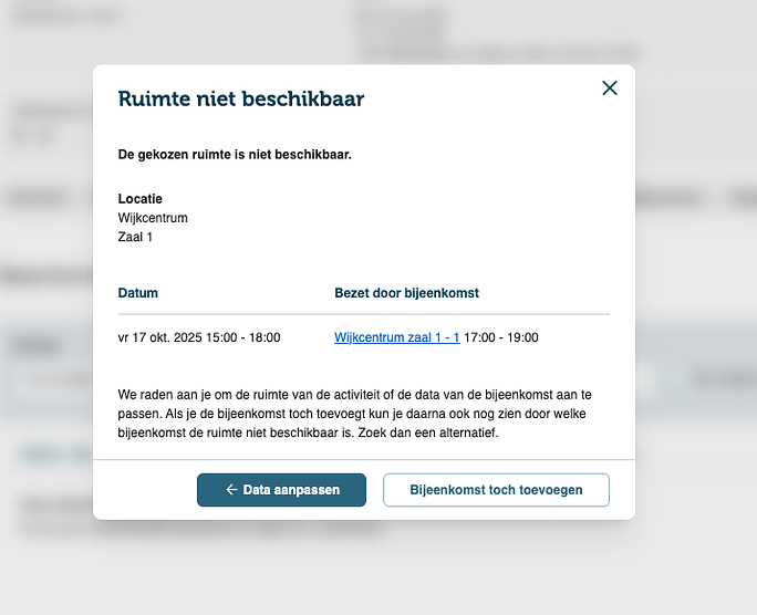 - Bij het aanmaken van bijeenkomsten kan het voorkomen dat de ruimte waar deze bijeenkomst zou plaatsvinden al bezet is. Dit wordt nu heel duidelijk zichtbaar gemaakt zodat je daar naar kan handelen.