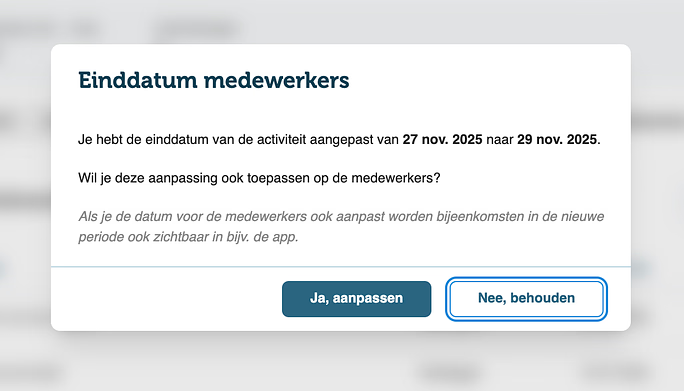 - Bij verlengen van activiteit, verandert einddatum van medewerkers mee