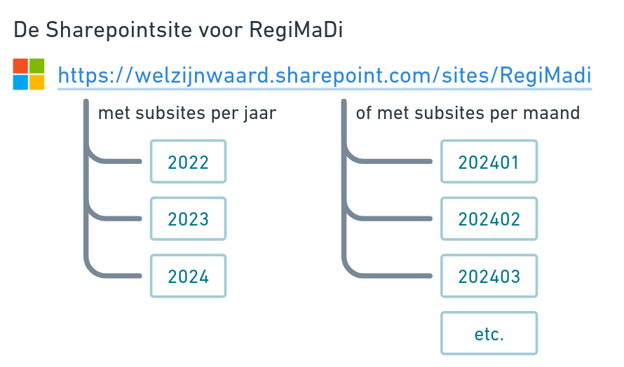 Door recente (2024) aanpassingen in het Microsoft beleid rondom het gebruik (limieten) van Sharepoint adviseren wij alle klanten om direct bij het installeren subsites (binnen RegiCare bekend als jaarsites en maandsites) te configureren. Schematisch kan een indeling er zoals in één van de twee opties in afbeelding 2.0 hieronder uit komen te zien.