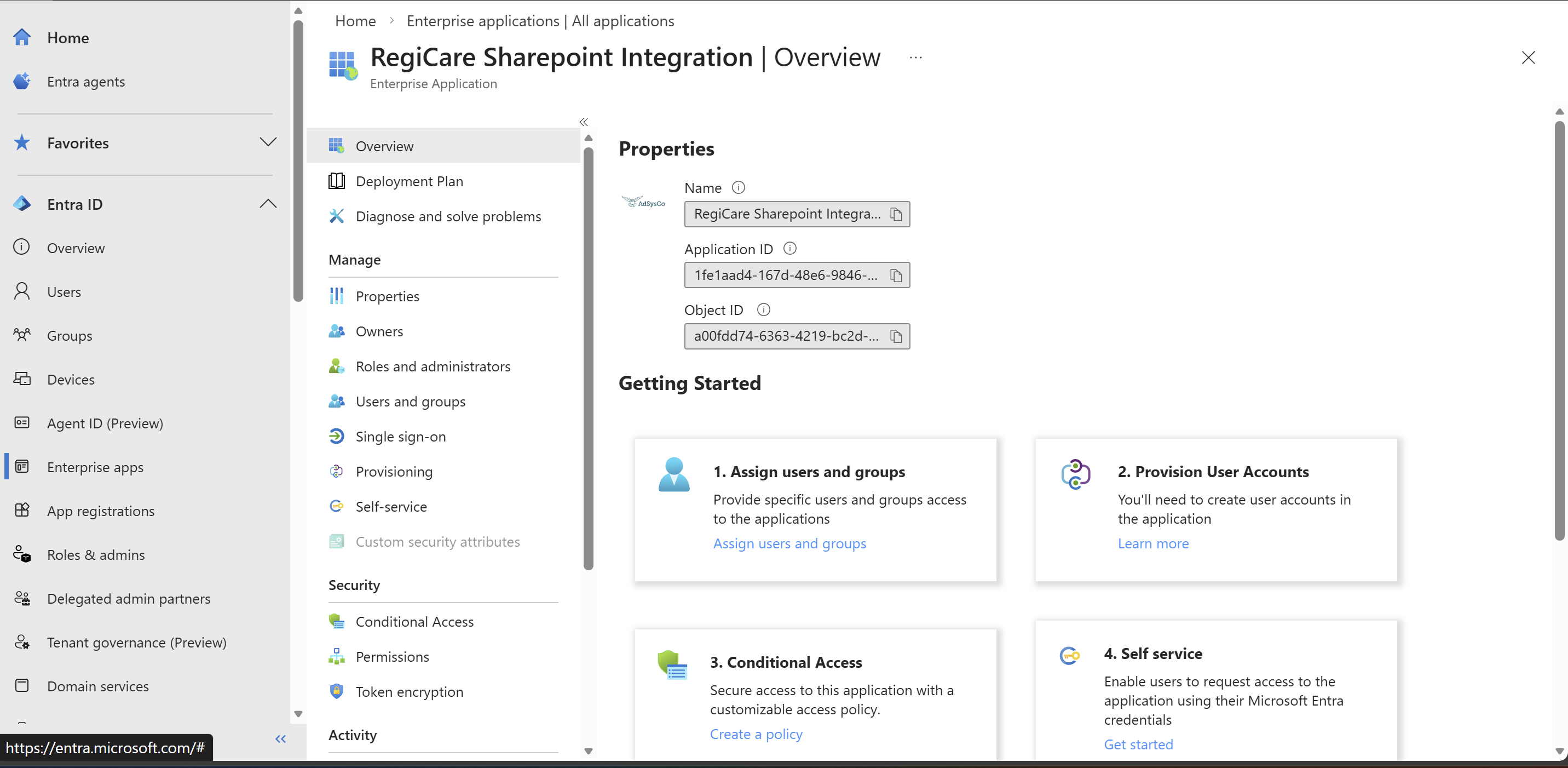 Zoek en open de applicatie RegiCare SharePoint Integration - of op ID: 1fe1aad4-167d-48e6-9846-d3f49e95ec61