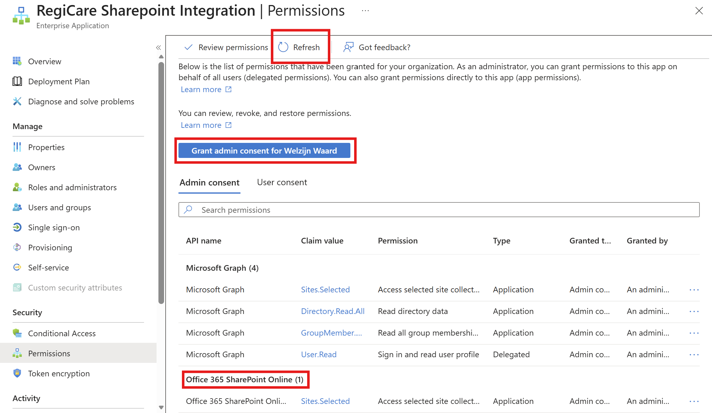 STAP 2 -Grand Admin Consent to RegiCare Sharepoint Integration app