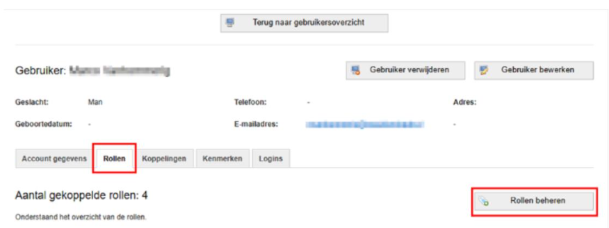 Na het aanmaken van de gebruiker moet de juiste rol worden toegekend aan de gebruiker. Dit wordt gedaan door de gebruiker te openen en vervolgens “Rollen beheren” te kiezen in het tabblad “Rollen”.