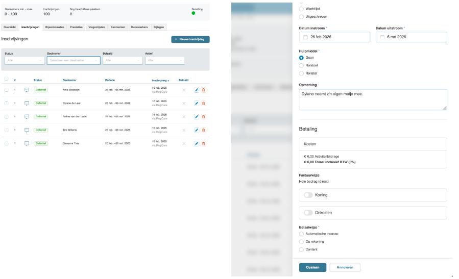 Het inschrijvingentabblad op de activiteitpagina is volledig vernieuwd. De oude weergave is vervangen door een moderner scherm dat sneller werkt en prettiger in gebruik is. Je kunt inschrijvingen bekijken, bewerken en toevoegen vanuit handige zijpanelen, zonder de pagina te verlaten.