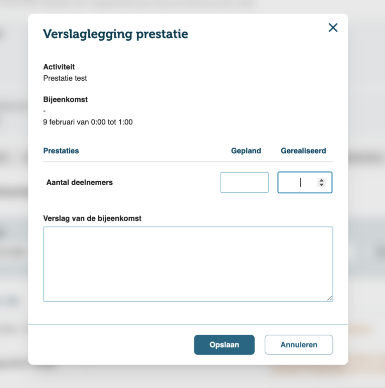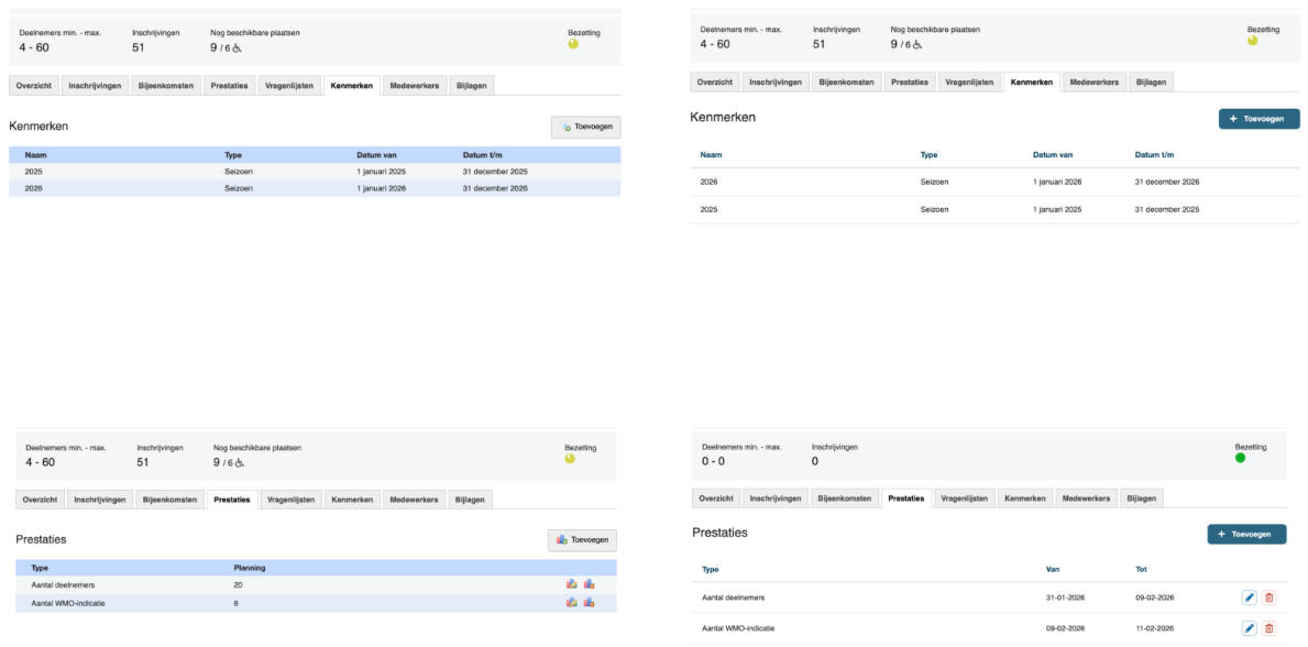 Je kunt nu per prestatie een datumbereik opgeven binnen een activiteit. Dit maakt het mogelijk om prestaties te registreren die niet voor de volledige duur van de activiteit gelden.