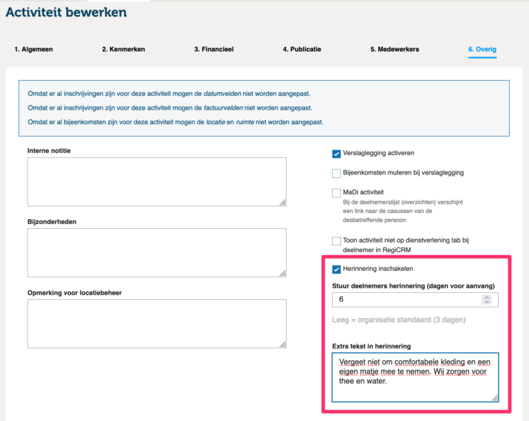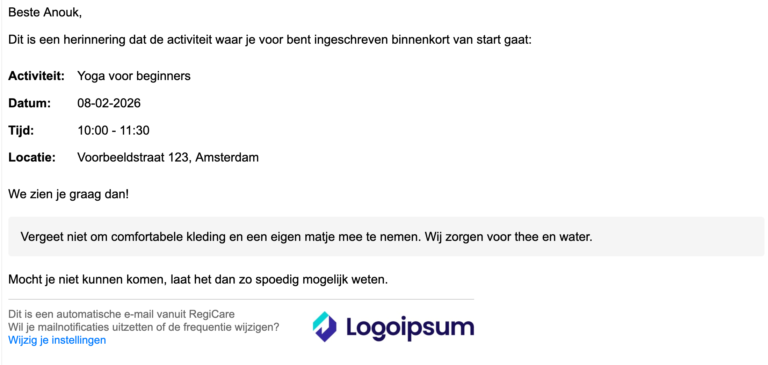 In het beheer van RegiCare is in te stellen of deze automatische herinneringen verstuurd mogen worden en hoeveel dagen van tevoren dit gebeurt. Als deze instelling aan staat, kun je per activiteit bepalen of je de reminder gebruikt. Je kunt daarnaast het aantal dagen aanpassen en een extra tekst toevoegen aan de e-mail.
