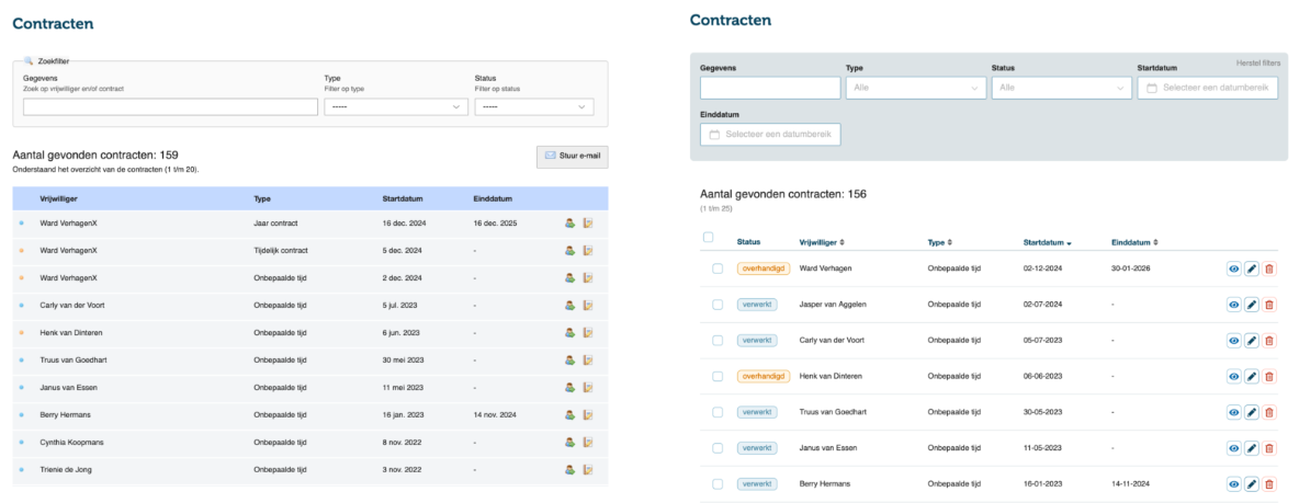- Sneller vinden wat je zoekt: Betere zoek- en filtermogelijkheden op contract- en vrijwilligersgegevens
