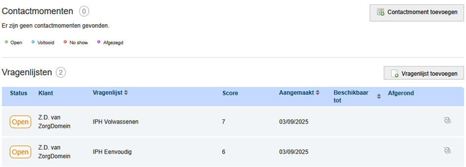 Naast het toevoegen van een contactmoment is er nu een aparte knop beschikbaar: ‘Vragenlijst toevoegen’.